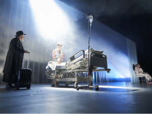 Die darauffolgende, circa 2 Stunden andauernde Inszenierung begann im Anschluss und konnte von uns in den vordersten Reihen genau beobachtet werden. Die Schauspieler waren gemischten Alters, besetzten die Rollen teils doppelt und trugen eine tendenziell eher moderne bis komödiantische Interpretation des Stücks vor. Mit dem klassischen literarischen Werk hatte das in unseren Augen nur noch wenig gemeinsam, so wirkte die im Krankenbett kletternde Recha, der im Kühlschrank lebende Derwisch oder der in fragwürdiger Beziehung zu der eigenen Schwester stehende Saladin für viele von uns recht befremdlich. Sehr interessiert hefteten die Blicke jedoch an einer älteren, mit Flügeln und Wein ausgestatteten Dame, welche, wie wir in einer späteren Nachbesprechung festhielten, das Alter-Ego des Tempelherren symbolisierte.